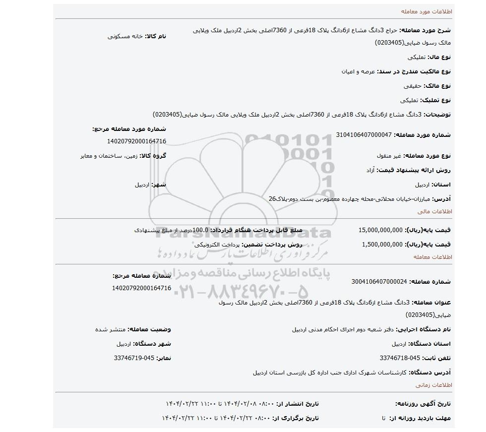 شرح مورد معامله: حراج 3دانگ مشاع از6دانگ پلاک 18فرعی از 7360اصلی بخش 2اردبیل ملک ویلایی مالک رسول ضیایی(0203405) | نام کالا: خانه مسکونی | |