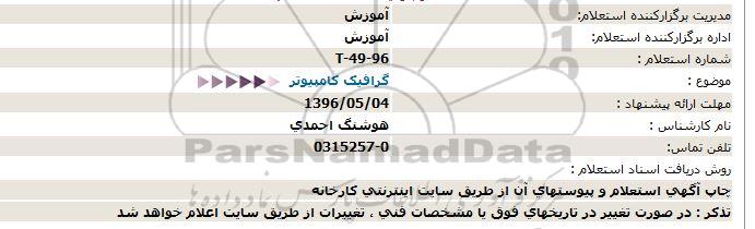 استعلام بها و موضوع استعلام استعلام گرافیک کامپیوتر به اطلاع کلیه شرکتها و افراد متخصص واجد شرایط میرساند، آگهی گذار در نظر دارد از طریق استعلام بها، نسبت به انتخاب و دریافت پیشنهادات اقدام نماید. این استعلام با کد آگهی ثبت شده در سامانه خبرگزاری پارس نماد : 893940 منتشر شده است. مشخصات استعلام : تاریخ شروع استعلام: 1396/04/27 آخرین مهلت ارسال پیشنهاد قیمت : 1396/05/04 و محل اجرای پروژه : استان اصفهان میباشد. استعلام قیمت مورد درخواست : استعلام گرافیک کامپیوتر با دستهبندیهای تخصصی و گروه های مرتبط : کامپیوتر, مشاوره تحقیقات و مدیریت استاندارد, استعلام اطلاع رسانی میگردد.