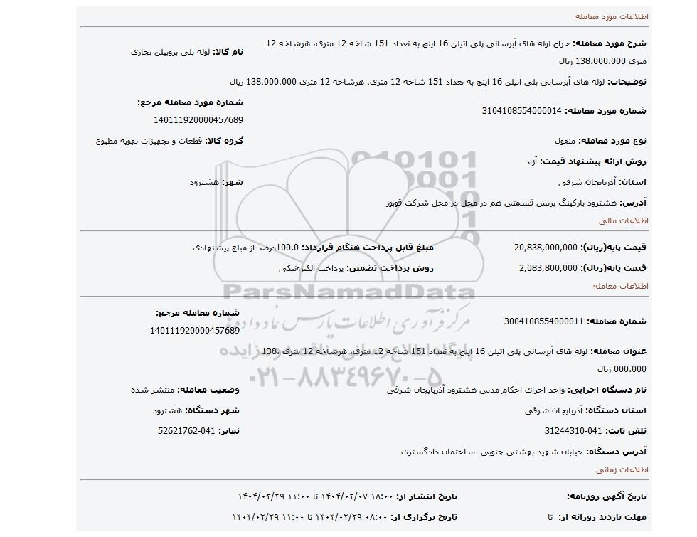 | شرح مورد معامله: حراج لوله های آبرسانی پلی اتیلن 16 اینچ به تعداد 151 شاخه 12 متری، هرشاخه 12 متری 138،000،000 ریال | نام کالا: لوله پلی پروپیلن تجاری | |