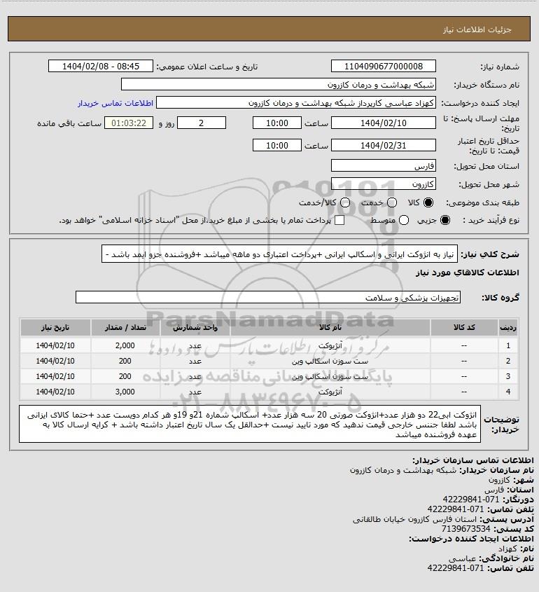 شرح کلی نیاز: نیاز به انژوکت ایرانی و اسکالپ ایرانی +پرداخت اعتباری دو ماهه میباشد +فروشنده جزو ایمد باشد -