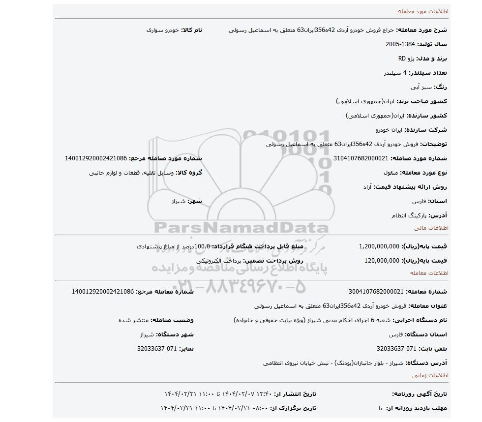 | عنوان معامله: فروش خودرو آردی 42ه356ایران63 متعلق به اسماعیل رسولی | ||