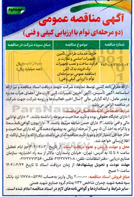 | 6820/07/217/040002 | خرید، خدمات طراحی، تأمین تجهیزات اساسی و نظارت بر فرآیند ساخت و نصب تجهیزات یک فروند یدک کش (مناقصه عمومی دو مرحله ای توام با ارزیابی کیفی و فنی) | 100.000.000.000ریال (صد میلیارد ریال) |