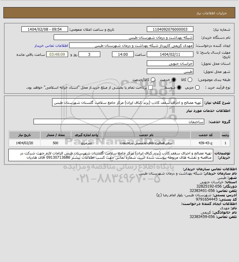 استعلام تهیه مصالح و اجرای سقف کاذب (برند کناف ایران) مرکز جامع سلامت گلستان شهرستان طبس, استعلام تهیه مصالح و اجرای سقف کاذب (برند کناف ایران) مرکز جامع سلامت گلستان شهرستان طبس