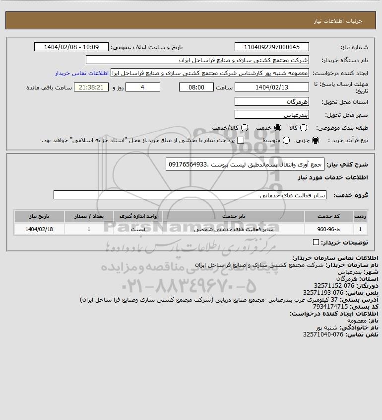 شرح کلی نیاز: جمع آوری وانتقال پسماندطبق لیست پیوست .09176564933