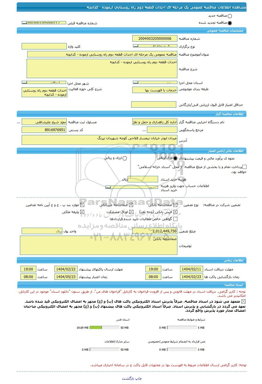 | مبلغ تضمین | 2,012,449,750 | واحد پول | ریال |