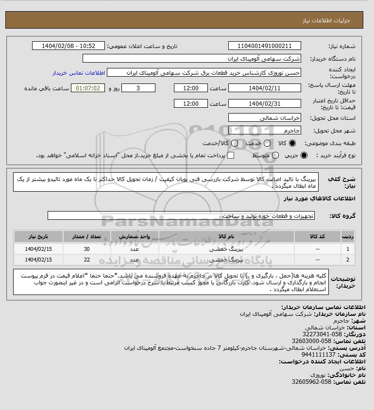 شرح کلی نیاز: بیرینگ با تائید اصالت کالا توسط شرکت بازرسی فنی پویان کیفیت / زمان تحویل کالا حداکثر تا یک ماه مورد تائیدو بیشتر از یک ماه ابطال میگردد .