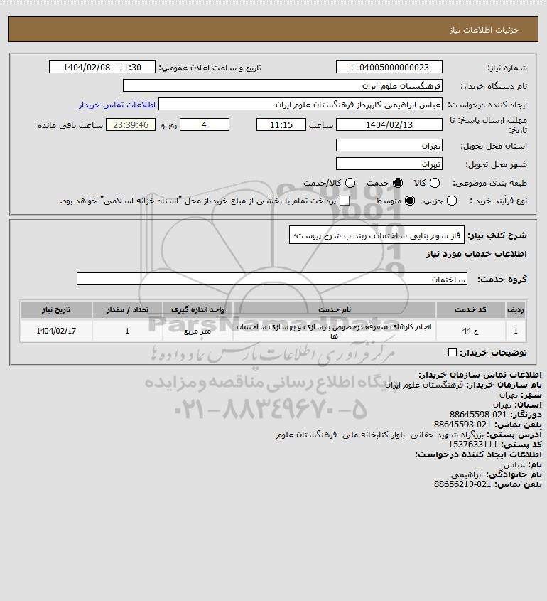 شرح کلی نیاز: فاز سوم بنایی ساختمان دربند ب شرح پیوست؛