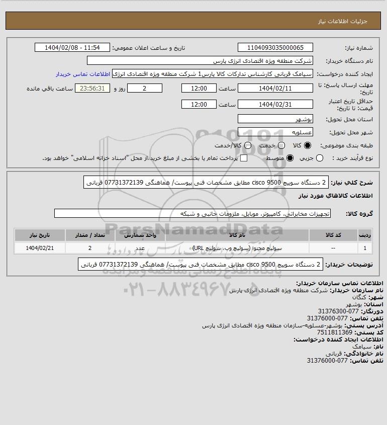 توضیحات خریدار:2 دستگاه سوییچ cisco 9500 مطابق مشخصات فنی پیوست/ هماهنگی 07731372139 قربانی