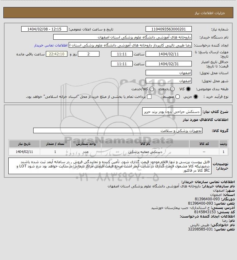 استعلام بها و موضوع استعلام استعلام دستکش جراحی بدون پودر برند حریر به اطلاع کلیه شرکتها و افراد متخصص واجد شرایط میرساند، آگهی گذار در نظر دارد از طریق استعلام بها، نسبت به انتخاب و دریافت پیشنهادات اقدام نماید. این استعلام با کد آگهی ثبت شده در سامانه خبرگزاری پارس نماد : 8941543 منتشر شده است. مشخصات استعلام : تاریخ شروع استعلام: 1404/02/08 آخرین مهلت ارسال پیشنهاد قیمت : 1404/02/11 و محل اجرای پروژه : استان اصفهان میباشد. استعلام قیمت مورد درخواست : استعلام دستکش جراحی بدون پودر برند حریر با دستهبندیهای تخصصی و گروه های مرتبط : خدمات و تجهیزات آزمایشگاهی و پزشکی, استعلام اطلاع رسانی میگردد.