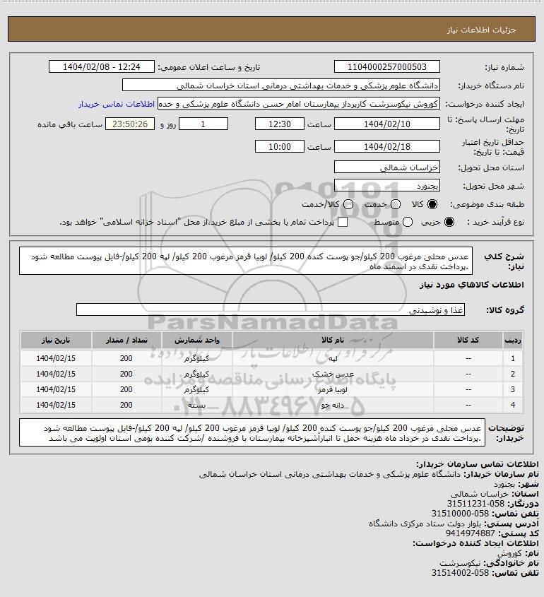 | 2 | -- | عدس خشک | کیلوگرم | 200 | 1404/02/15 |