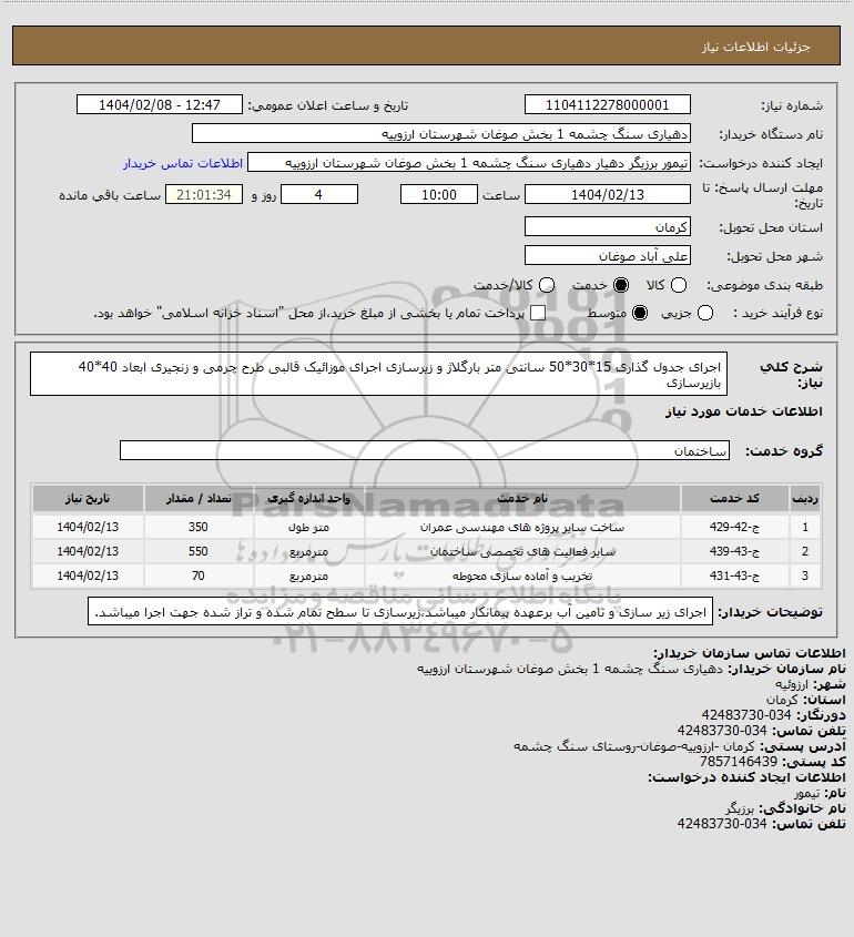 شرح کلی نیاز: اجرای جدول گذاری 15*30*50 سانتی متر بارگلاژ و زیرسازی