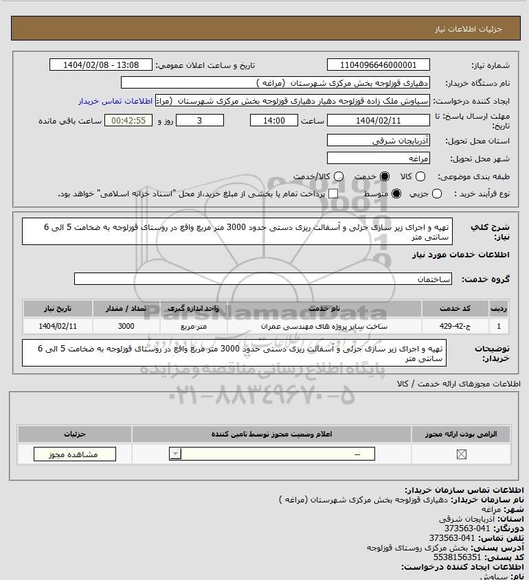 توضیحات خریدار:تهیه و اجرای زیر سازی جزئی و آسفالت ریزی دستی حدود 3000 متر مربع واقع در روستای قوزلوجه به ضخامت 5 الی 6 سانتی متر