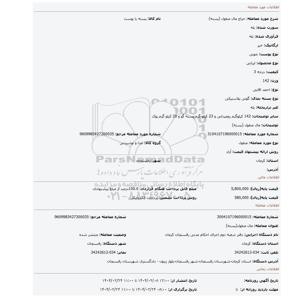 | شرح مورد معامله: حراج مال منقول (پسته) | نام کالا: پسته با پوست | |