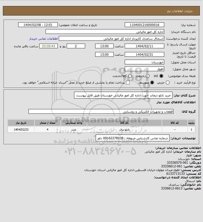 استعلام خرید تابلو دیماند جهت اداره کل امور مالیاتی خوزستان طبق فایل پیوست., استعلام خرید تابلو دیماند جهت اداره کل امور مالیاتی خوزستان طبق فایل پیوست.