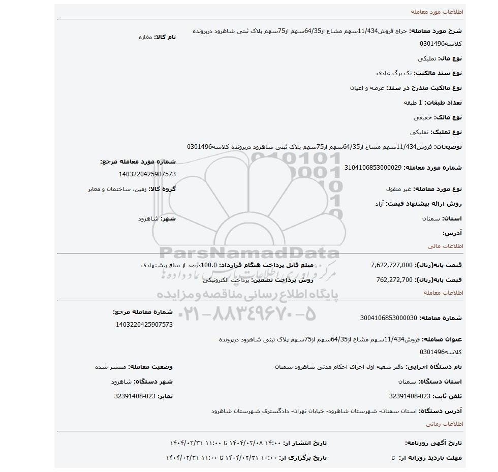 | عنوان معامله: فروش11/434سهم مشاع از64/35سهم از75سهم پلاک ثبتی شاهرود درپرونده کلاسه0301496 | ||