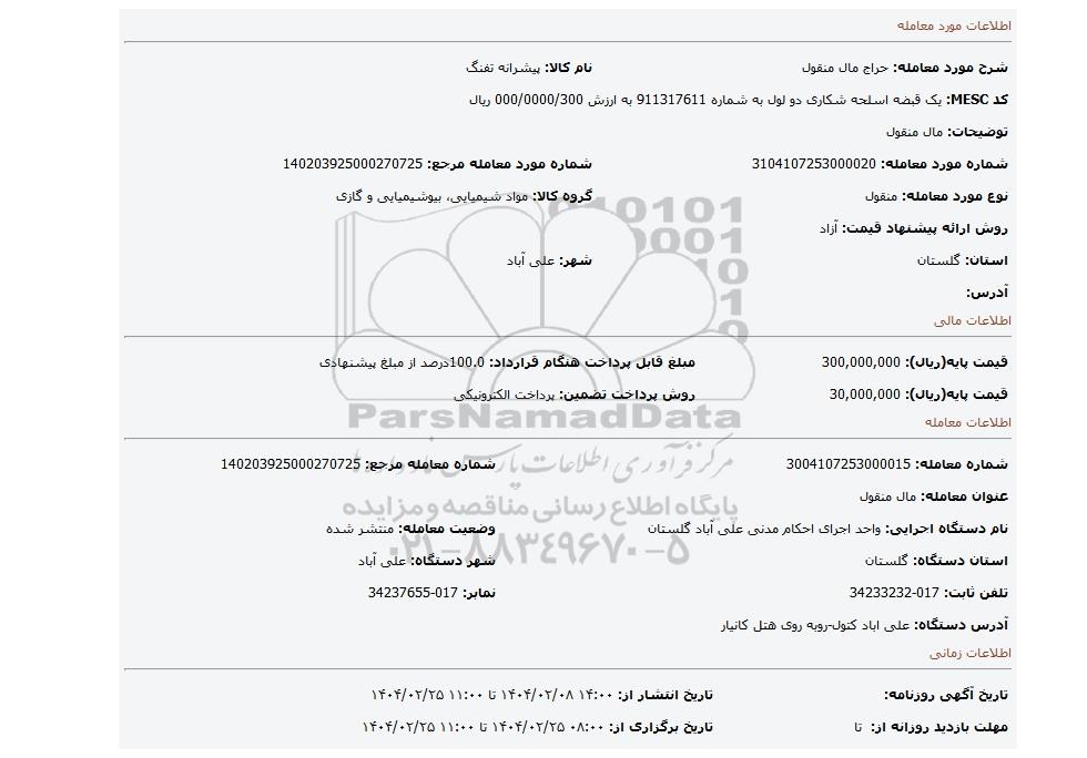| کد MESC: یک قبضه اسلحه شکاری دو لول به شماره 911317611 به ارزش 000/0000/300 ریال | ||