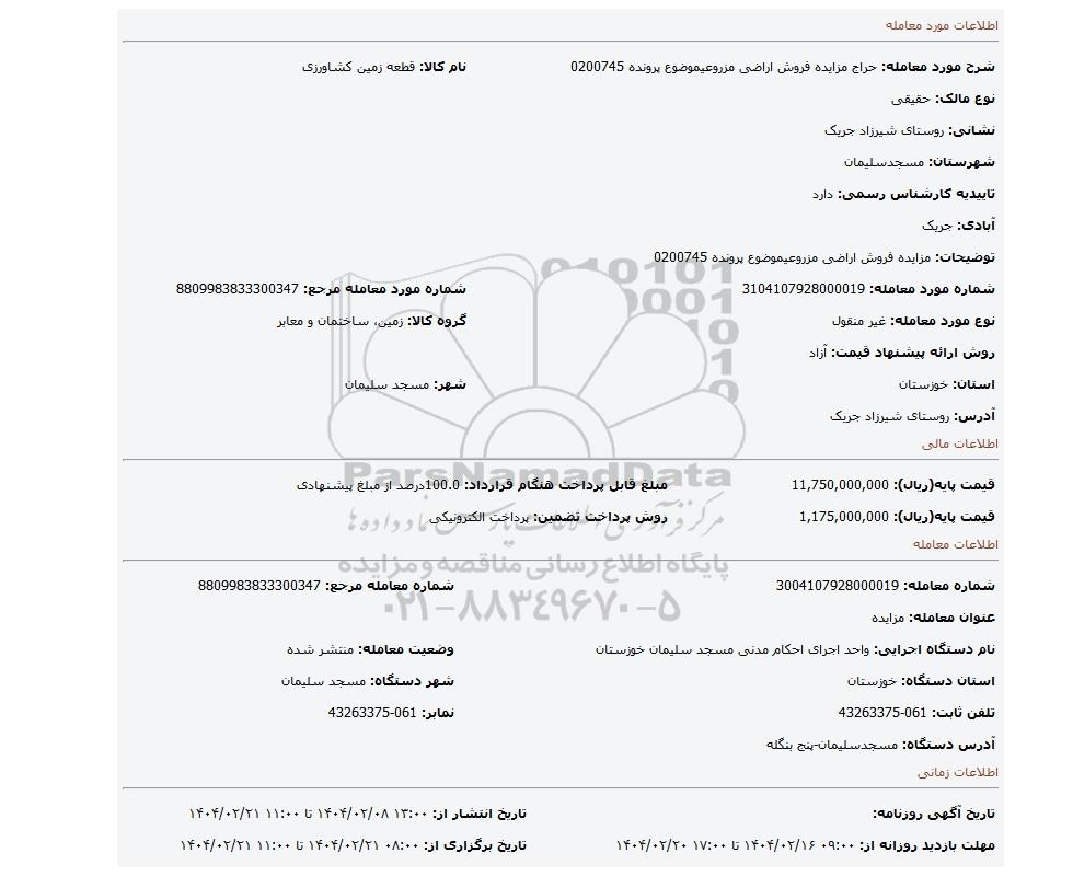 | شرح مورد معامله: حراج مزایده فروش اراضی مزروعیموضوع پرونده 0200745 | نام کالا: قطعه زمین کشاورزی | |