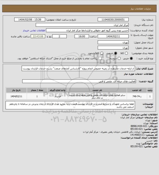 شرح کلی نیاز: از ارایه خدمات مشاوره در زمینه خصوص انجام پروژه "کارشناس آمارهای صنعت" بشرح خدمات قرارداد پیوست