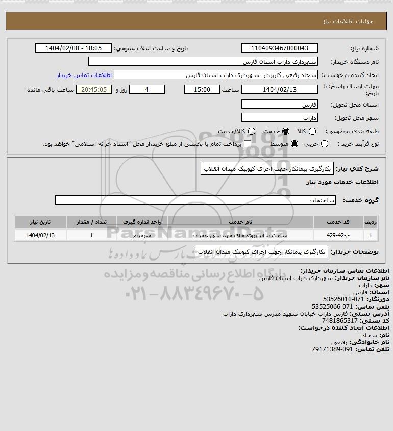 توضیحات خریدار:بکارگیری پیمانکار جهت اجرای کیوبیک میدان انقلاب