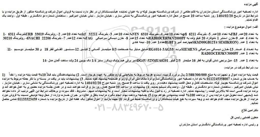 اداره تصفیه امور ورشکستگی استان مازندران به قائم مقامی از شرکت ورشکسته جویبار لوله و به عنوان نماینده هیأت بستانکاران در نظر دارد نسبت به فروش اموال شرکت ورشکسته مذکور از طریق مزایده و با شرایط ذیل در تاریخ 1404/02/20 روز شنبه ساعت 10 صبح در محل اداره تصفیه امور ورشکستگی به نشانی ساری ، خیابان مازیار ، نبش خیابان امیرکبیر ، ساختمان شماره دو دادگستری ، طبقه اول ، واحد یک اقدام نماید.