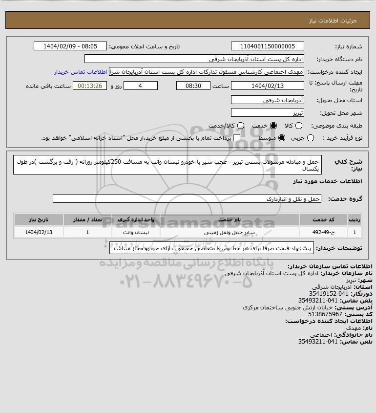 استعلام حمل و مبادله مرسولات پستی تبریز - عجب شیر با خودرو نیسان وانت به مسافت 250کیلومتر روزانه ( رفت و برگشت )در طول یکسال, استعلام حمل و مبادله مرسولات پستی تبریز - عجب شیر با خودرو نیسان وانت به مسافت 250کیلومتر روزانه ( رفت و برگشت )در طول یکسال