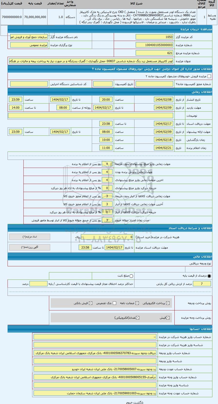 | کد مزایده گزار | 1053 | نام دستگاه مزایده گزار | سازمان جمع آوری و فروش اموال تملیکی | |