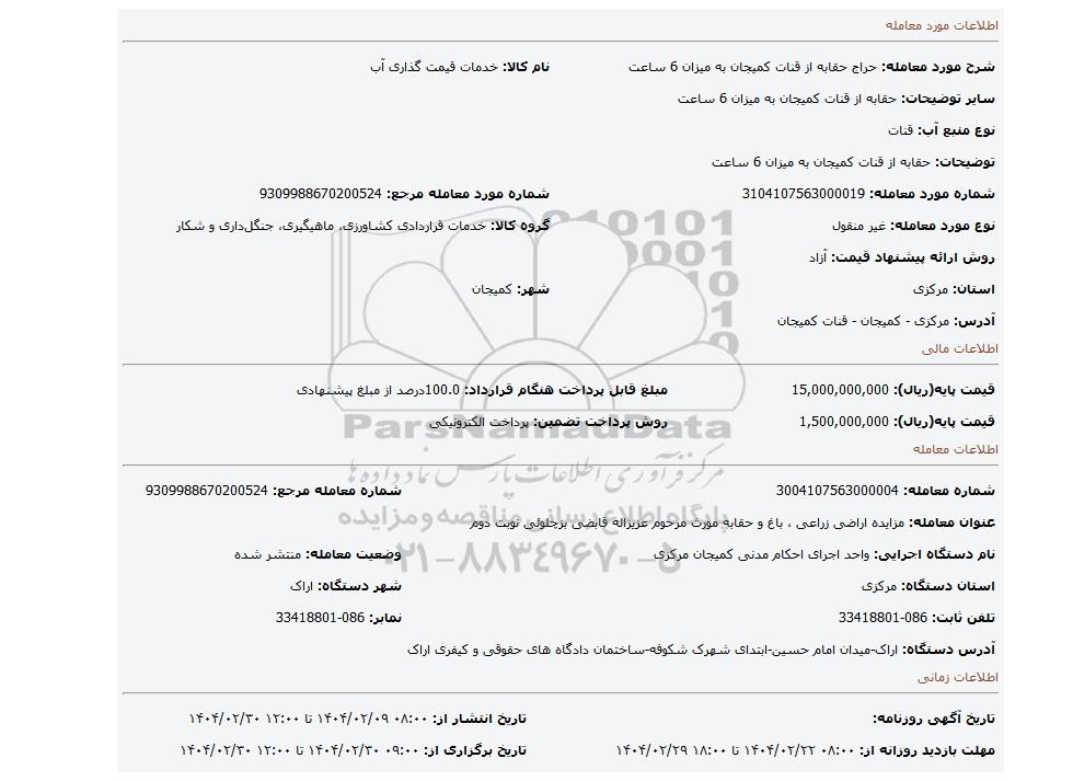 مزایده حقابه از قنات کمیجان به میزان 6 ساعت, مزایده، حقابه از قنات کمیجان به میزان 6 ساعت