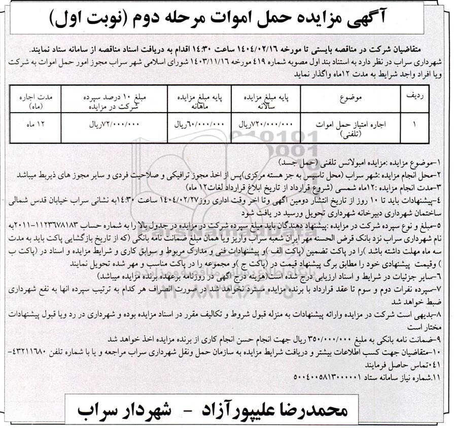 شهرداری سراب در نظر دارد به استناد بند اول مصوبه شماره 419 مورخه 1404.11.16 شورای اسلامی شهر سراب مجوز امور حمل اموات به شرکت و یا افراد واجد شرایط به مدت 12 ماه واگذار نماید .