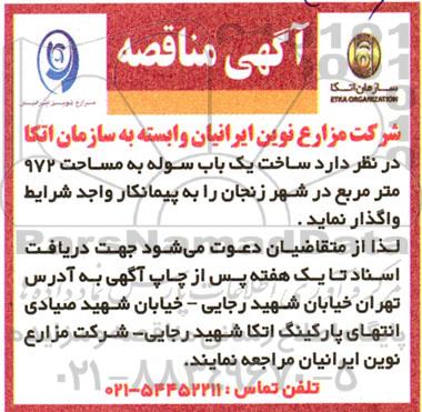 شرکت مزارع نوین ایرانیان وابسته به سازمان اتکا در نظر دارد ساخت یک باب سوله به مساحت 972 مترمربع در شهر زنجان را به پیمانکار واجد شرایطی واگذار نماید