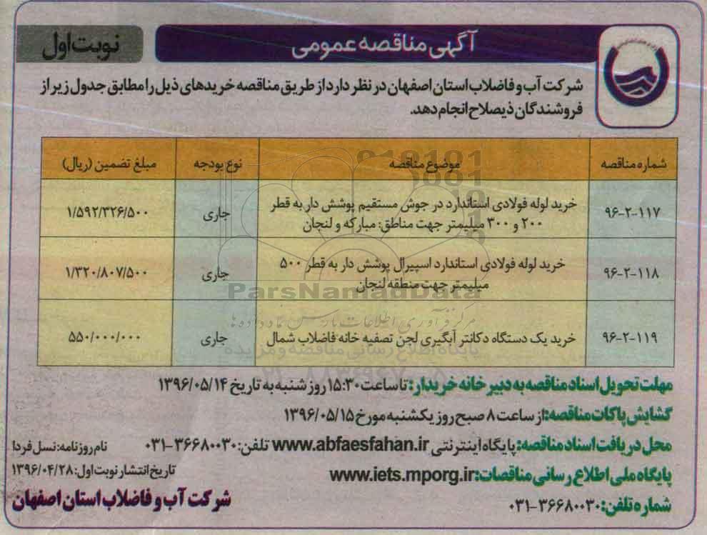 شرکت آب و فاضلاب استان اصفهان در نظر دارد از طریق مناقصه عمومی به خریدهای ذیل کطابق جدول زیر از فروشندگان ذیصلاح انجام دهد .