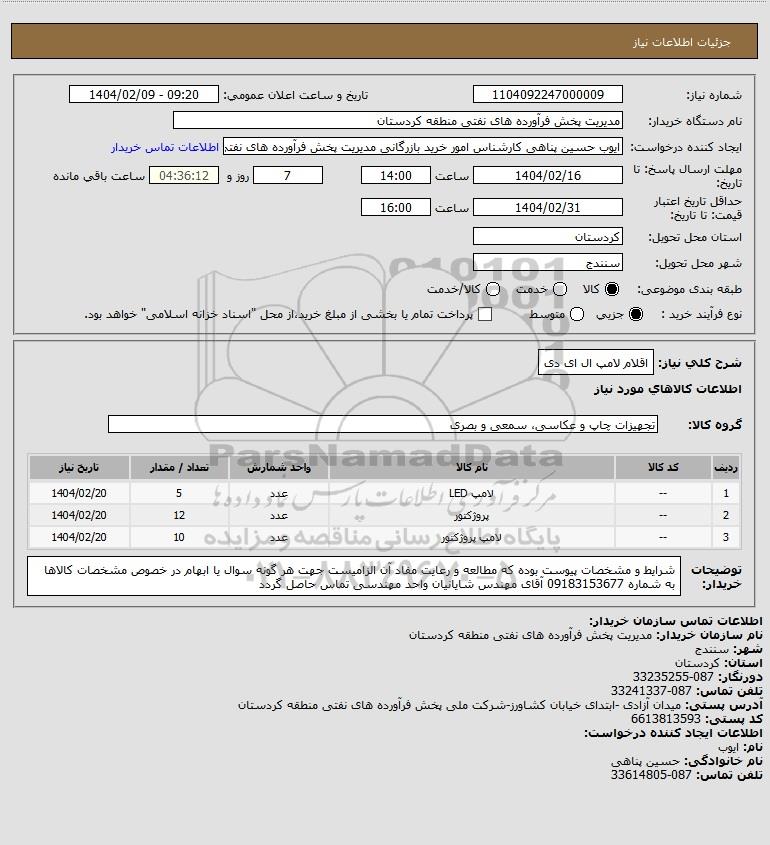 | 3 | -- | لامپ پروژکتور | عدد | 10 | 1404/02/20 |