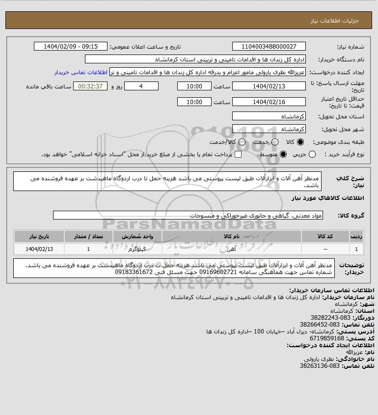 توضیحات خریدار:مدنظر آهن آلات و ابزارآلات طبق لیست پیوستی می باشد هزینه حمل ت درب اردوگاه ماهیدشت بر عهده فروشنده می باشد. شماره تماس جهت هماهنگی سامانه 09169602721 جهت مسئل فنی 09183361672
