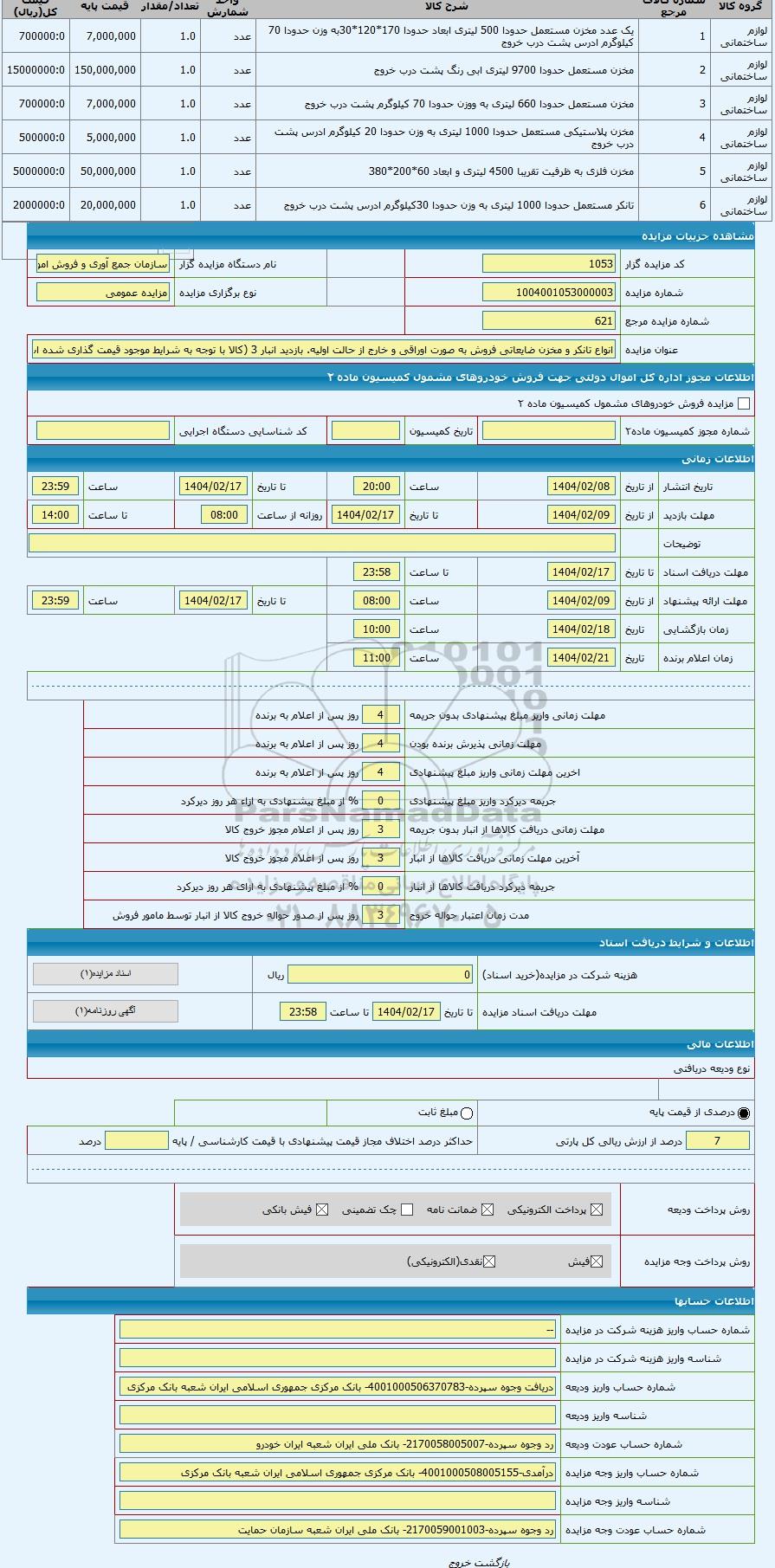 | لوازم ساختمانی | 3 | مخزن مستعمل حدودا 660 لیتری به ووزن حدودا 70 کیلوگرم پشت درب خروج | عدد | 1.0 | 7,000,000 | 700000:0 |