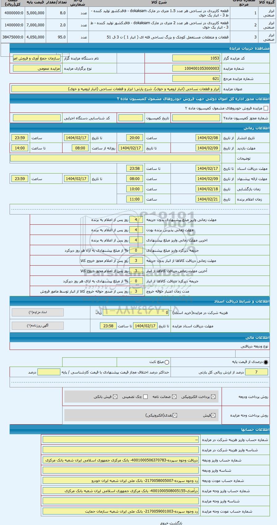 | عنوان مزایده | ابزار و قطعات نساجی (انبار ارومیه و خوی) | |||