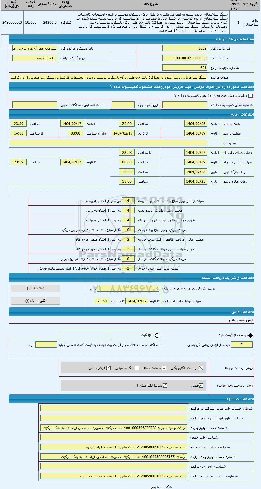 مزایده عمومی مزایده سنگ ساختمانی بریده شده به تعدا 12 پالت وزن طبق برگه باسکول پیوست پرونده - توضیحات کارشناس سنگ ساختمانی از نوع گرانیت و برگزار میگردد. از کلیه افراد متخصص و شرکتهای واجد شرایط دعوت به عمل میآید تا در این مزایده با کد خبرگزاری پارس نماد : 8947129 شرکت نمایند تاریخ شروع مزایده : 1404/02/08 مهلت شرکت در مزایده: تا پایان روز 1404/02/17 مکان برگزاری اموال واگذاری استانهای آذربایجان غربی و دستهبندیهای مربوط به این حراجی مصالح ساختمانی میباشد.