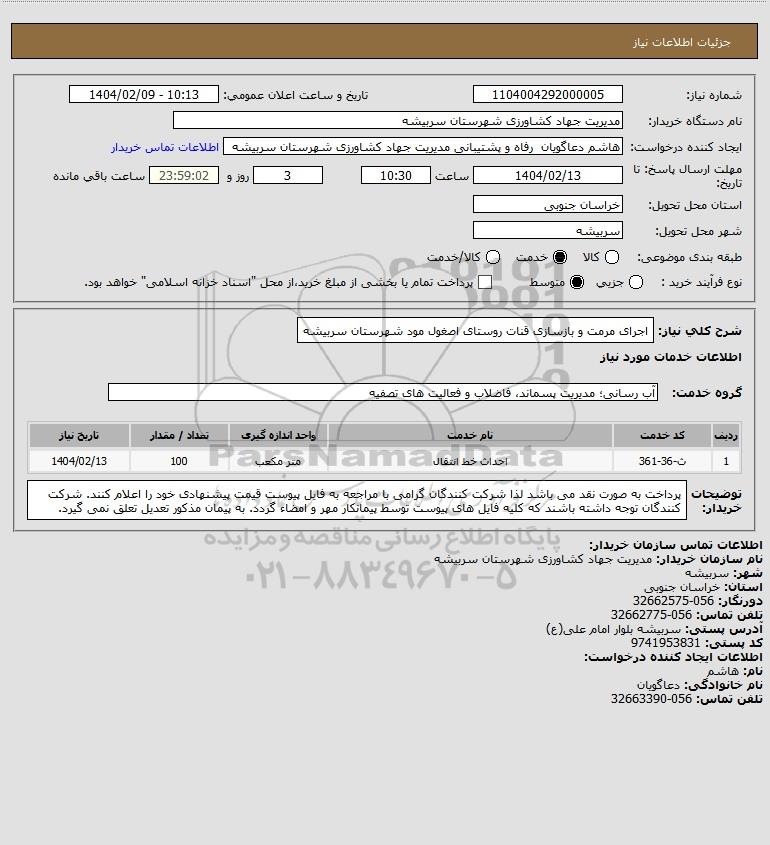 شرح کلی نیاز: اجرای مرمت و بازسازی قنات روستای اصغول مود شهرستان سربیشه
