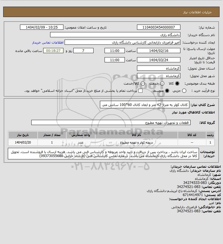 شرح کلی نیاز: کانال کولر به متراژ 42 متر و ابعاد کانال 60*100 سانتی متر.