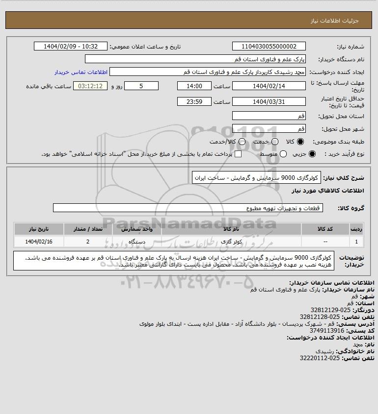 شرح کلی نیاز: کولرگازی 9000 سرمایش و گرمایش - ساخت ایران