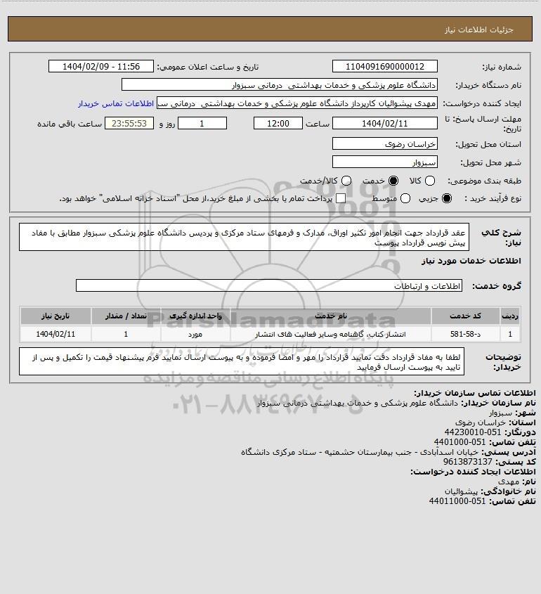 شرح کلی نیاز: عقد قرارداد جهت انجام امور تکثیر اوراق، مدارک و فرمهای ستاد مرکزی و پردیس دانشگاه علوم پزشکی سبزوار مطابق با مفاد پیش نویس قرارداد پیوست