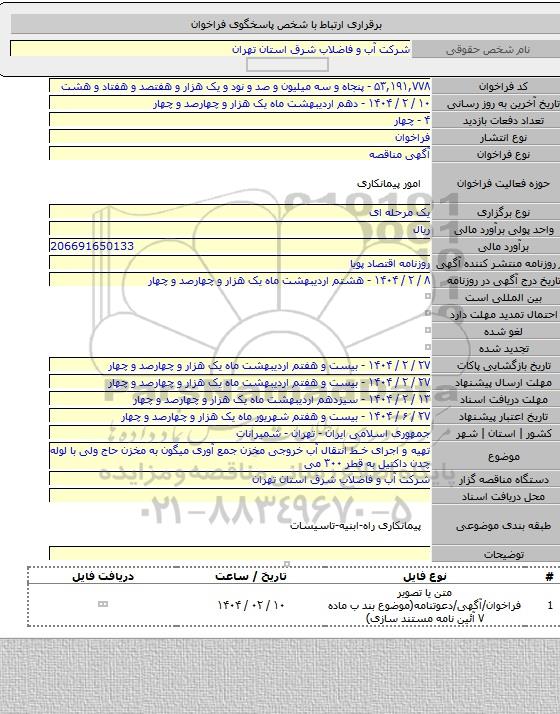 علاقهمندان میتوانند جهت دریافت اسناد و اطلاعات تکمیلی، مناقصه تهیه و اجرای خط انتقال آب خروجی مخزن جمع آوری میگون به مخزن حاج ولی با لوله چدن داکتیل به قطر ۳۰۰ می با سامانه مناقصات و مزایدات ایران پارسنماد داده ها 88349670 تماس حاصل نمایند.