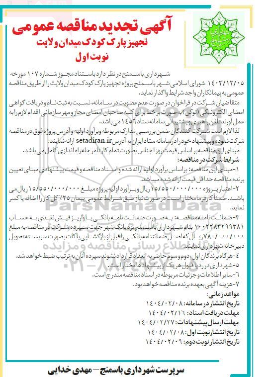 شهرداری باسمنج در نظر دارد با استناد مجوز شماره 107 مورخه 1403.12.05 شورای اسلامی شهر باسمنج پروژه تجهیز پارک کودک میدان ولایت را از طریق مناقصه عمومی به پیمانکاران واجد شرایط واگذار نماید.