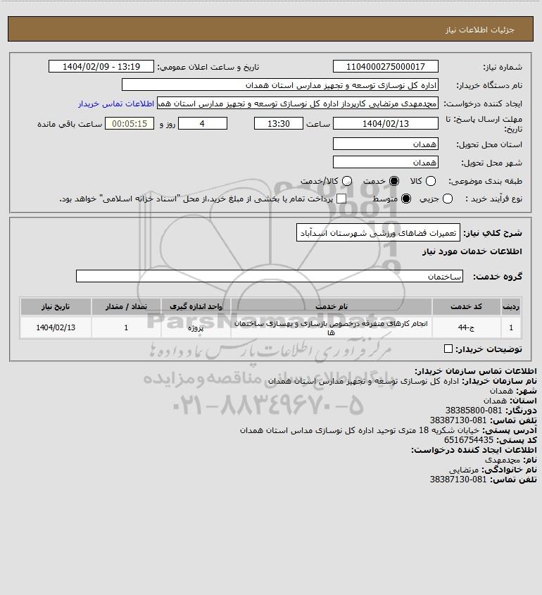شرح کلی نیاز: تعمیرات فضاهای ورزشی شهرستان اسدآباد