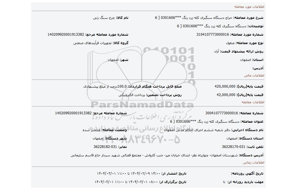 | عنوان معامله: دستگاه سنگبری کله زرد رنگ ***0301606 [ 6 | ||