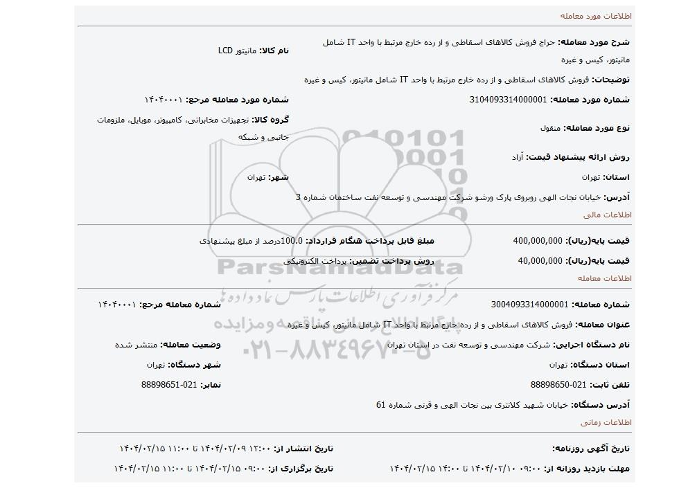 | عنوان معامله: فروش کالاهای اسقاطی و از رده خارج مرتبط با واحد IT شامل مانیتور، کیس و غیره | ||