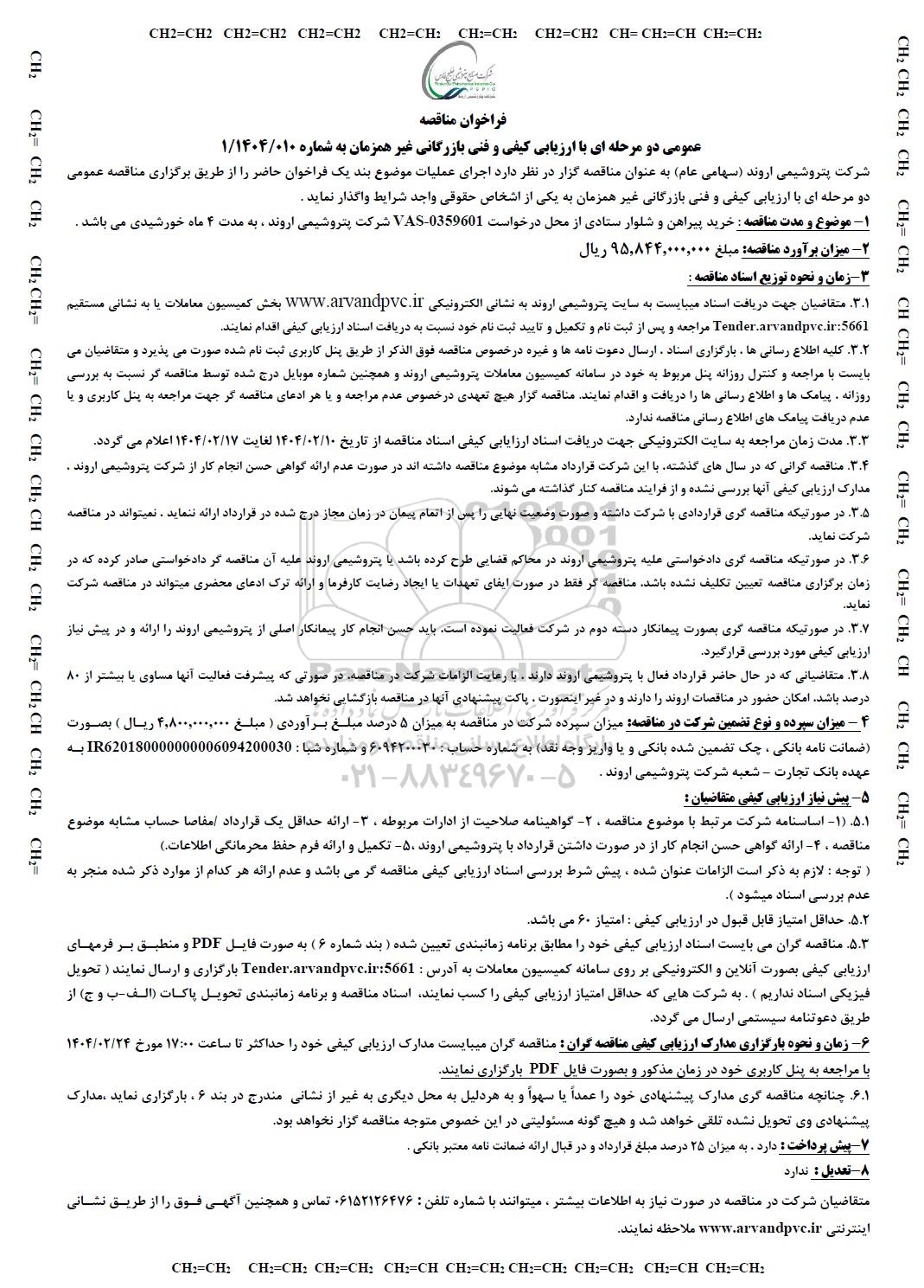 متقاضیان شرکت در مناقصه در صورت نیاز به اطلاعات بیشتر ، میتوانند با شماره تلفن : 06152126476 تماس و همچنین آگهی فوق را از طریق نشانی اینترنتی www.arvandpvc.ir ملاحظه نمایند.