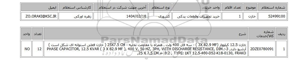 | 52499100 | خازن | 1 | خرید تجهیزات وقطعات یدکی | کشوری | 1404/02/18 | زهره اورکی | ZO.ORAKI@KSC.IR |