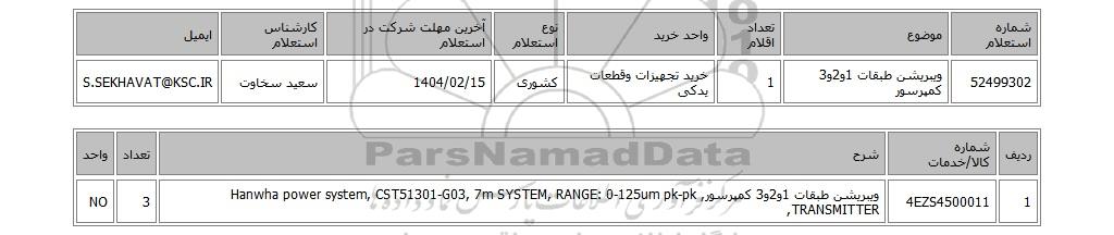 | 52499302 | ویبریشن طبقات 1و2و3 کمپرسور | 1 | خرید تجهیزات وقطعات یدکی | کشوری | 1404/02/15 | سعید سخاوت | S.SEKHAVAT@KSC.IR |