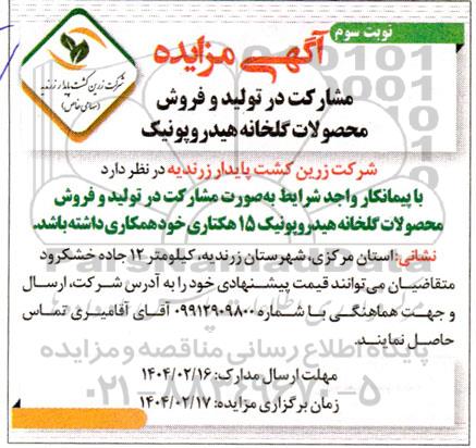 شرکت زرین کشت پایدار زرندیه در نظر دارد با پیمانکار واجد شرایط به صورت مشارکت در تولید و فروش محصولات گلخانه هیدروپونیک 15 هکتاری خود همکاری داشته باشد.