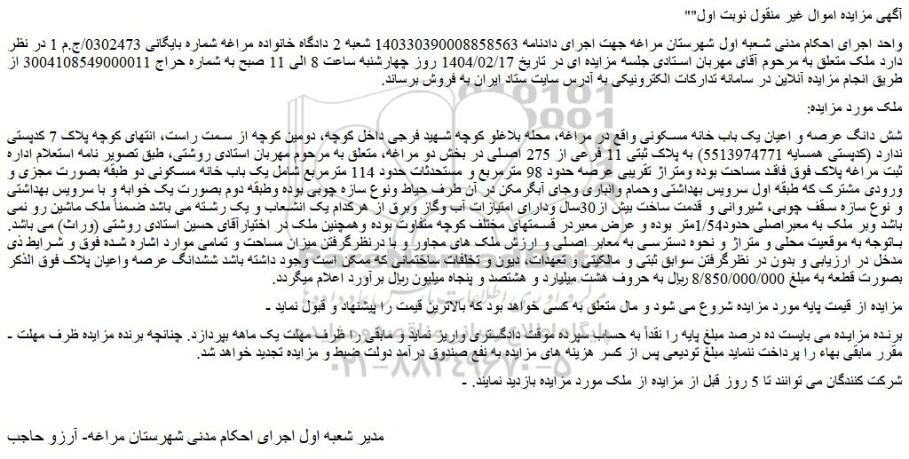 واحد اجرای احکام مدنی شعبه اول شهرستان مراغه جهت اجرای دادنامه 140330390008858563 شعبه 2 دادگاه خانواده مراغه شماره بایگانی 0302473/ج.م 1 در نظر دارد ملک متعلق به مرحوم آقای مهربان استادی جلسه مزایده ای در تاریخ 1404/02/17 روز چهارشنبه ساعت 8 الی 11 صبح به شماره حراج 3004108549000011 از طریق انجام مزایده آنلاین در سامانه تدارکات الکترونیکی به آدرس سایت ستاد ایران به فروش برساند.