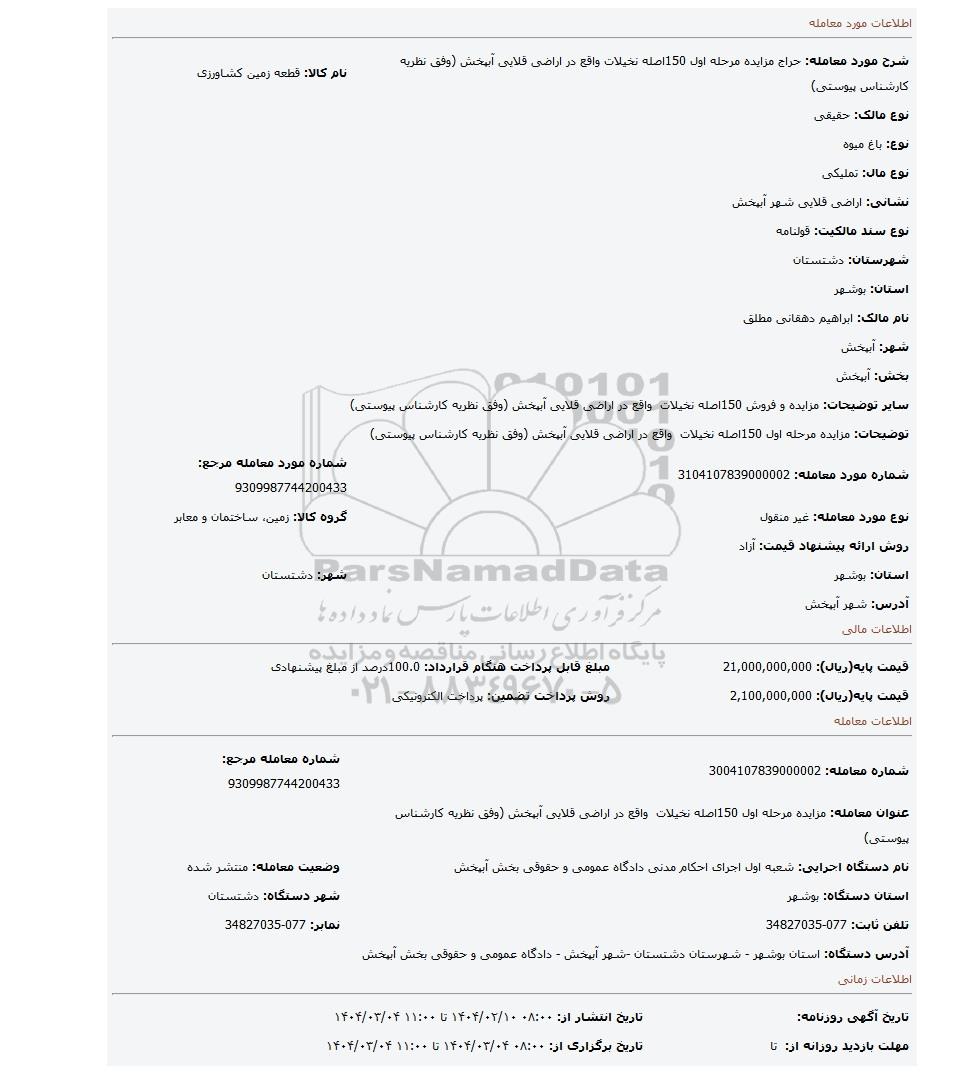| شماره مورد معامله: 3104107839000002 | شماره مورد معامله مرجع: 9309987744200433 | |